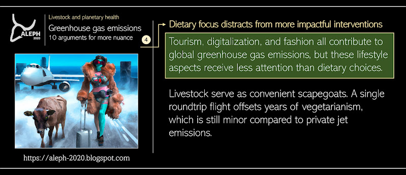 Matters of diet seem to be elbowing other topics out of the climate change discourse. However, as outlined in above in Argument 3, a shift to plant-based diets would only save a small amount of carbon. The often used comparison of the GHG emissions of livestock to the transport sector is misleading for a number of reasons (detailed in the text below). Tourism, digitalization, and fashion all contribute to global greenhouse gas emissions, but these lifestyle aspects receive less attention than dietary choices. Livestock serve as convenient scapegoats. A single roundtrip flight offsets years of vegetarianism, which is still minor compared to private jet emissions. Ultimately, a small minority generates most global emissions.From a climatic reasoning perspective, the overall carbon footprint should remain below one's 'harm budget'. This implies that the focus should not be on single actions but on aggregates [Kortetmäki & Oksanen 2020]. Overstating effects from farming and dietary choices distracts from the more impactful emissions related to extractive Western lifestyles and their reliance on fossil fuels [Haniotis 2019]. Just 90 companies have been driving 63% of the GHG emissions between 1751 and 2010, with half of those emissions taking place after 1988 [Starr 2016]. Also, just 100 companies have been the source of more than 70% of the world’s greenhouse gas emissions since 1988 [Riley 2017].